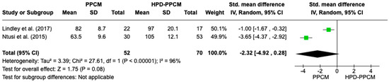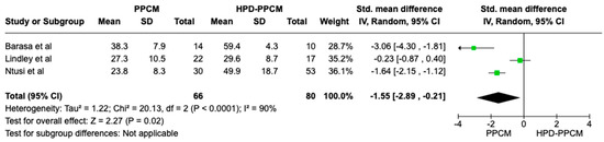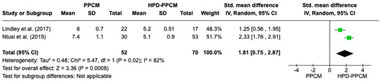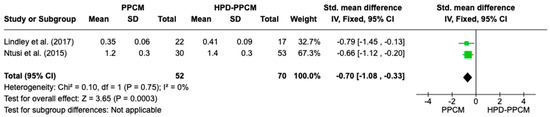 Forest plot of the impact of PPCM vs. HPD-PPCM on relative wall thickness reduction [15,22].