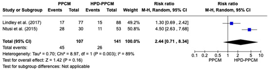 Similar to previous analyses of furosemide initiation after diagnosis, only two studies (Lindley et al. and Ntusi et al.) [15,22] included an analysis of the initiation of beta-blockers in their studies. Figure 7 revealed that beta-blocker was more likely used in HPD-PPCM patients after diagnosis, although not significant (RR = 2.44) [95% CI; 0.71,8.34, p = 0.16], which may favor diseases’ outcomes. A high heterogeneity was identified (I2 = 89%, p = 0.003).