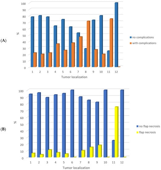 We analyzed the frequency of head and neck tumor localization and overall complication occurrence (p = 0.07, Fisher’s exact test), as well as frequency of tumor localization and necrosis (p = 0.03, Fisher’s exact test), and hematoma (p = 0.05, Fisher’s exact test) (Figure 1).