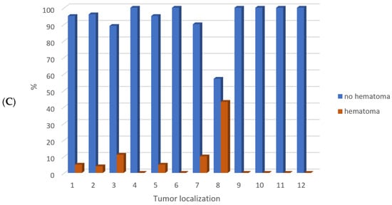 The frequency of head and neck tumor localization and overall complication occurrence (p = 0.07, Fisher’s exact test) (A), flap necrosis (p = 0.03, Fisher’s exact test) (B), and hematoma (p = 0.05, Fisher’s exact test) (C). Legend: 1 gingiva of the mandibula 46/194 (23.7%), 2 tongue 25/194 (12.9%), 3 cheek 9/194 (4.6%), 4 retromolar 14/194 (7.2%), 5 floor of the oral cavity 43/194 (22.2%), 6 oropharynx 8/194 (4.1%), 7 maxilla 19/194 (9.8%), 8 nasal cavity 7/194 (3.6%), 9 skin of the face 11/194 (5.7%), 10 palate 5/194 (2.6%), 11 skull base 4/194 (2.1%), 12 orbit 3/194 (1.5%).