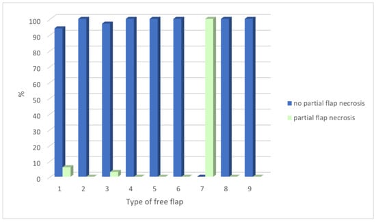 Furthermore, we analyzed the type of microvascular flap and complication occurrence, especially necrosis (p = 0.04, Fisher’s exact test), as well as partial necrosis (p = 0.07, Fisher’s exact test) (Figure 2).