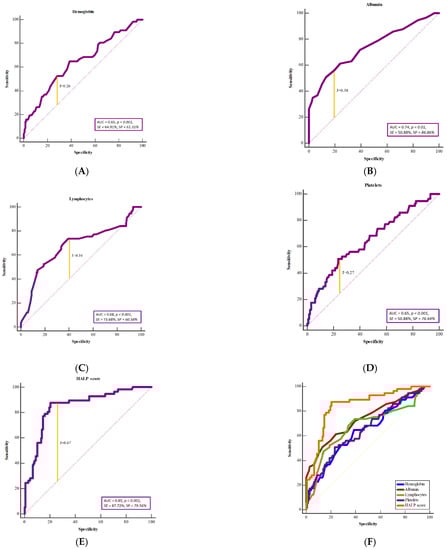 Receiver operating characteristic curve analysis (ROC) for overall complication to show the potential prognostic value of hemoglobin level (A), platelet level (B), albumin level (C), lymphocyte level (D), and HALP score (E). The HALP score has the greatest prognostic significance in predicting overall complications associated with the microvascular flap compared with the individual laboratory parameters (F). AUC—area under the curve, SE—sensitivity (%), SP—specificity (%), J—Youden index.