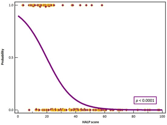 Logistic regression analysis showed statistically significant association of preoperative HALP value with occurrence of complications (p < 0.0001, R2 = 0.40). Purple boxes with yellow outlines present cases.