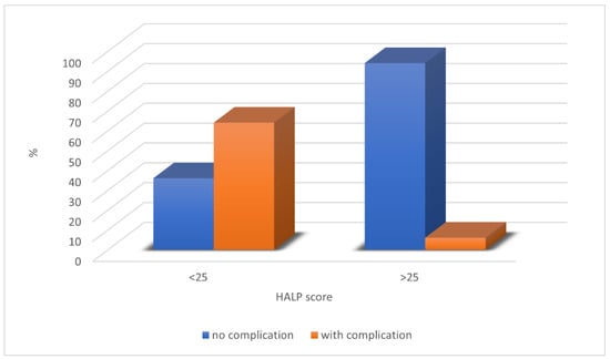Furthermore, we set up the HALP score cut-off value of 25. Statistical significance was shown between the groups of subjects (χ2 = 75.41, p < 0.0001). According to our analysis, a HALP score of 25 can be used as a reference value for predicting the occurrence of complications before surgery in patients requiring a reconstructive procedure with a free microvascular flap (Figure 5).