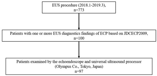 From January 2018 through to March 2019 at our institution, 773 patients in which the whole pancreas could be observed by EUS were examined (Figure 1). From these, K.K. and A.Y. extracted 100 consecutive patients who had EUS diagnostic findings of ECP based on JDCECP2009 from medical records. In making the diagnoses, all cases were finalized and authorized by eight experts, for whom the interobserver reliability (IOR) had a kappa value (K) > 0.4. The examinations were performed using an electronic scanner (EG580UT, EG580UR; Fujifilm Corp., Tokyo, Japan or GF-UCT260, GF-UE290; Olympus Corp., Tokyo, Japan). For this study, we specifically selected 97 patients who were examined using GF-UCT260 or GF-UE290 (Figure 2). Based on RC, three EUS images were extracted in each case from the pancreatic body to the pancreatic tail []. We excluded patients with either probable CP or definite CP and pancreatic neoplasms, at the time of diagnosis, based on the CP 2009/2019 diagnostic criteria [,].