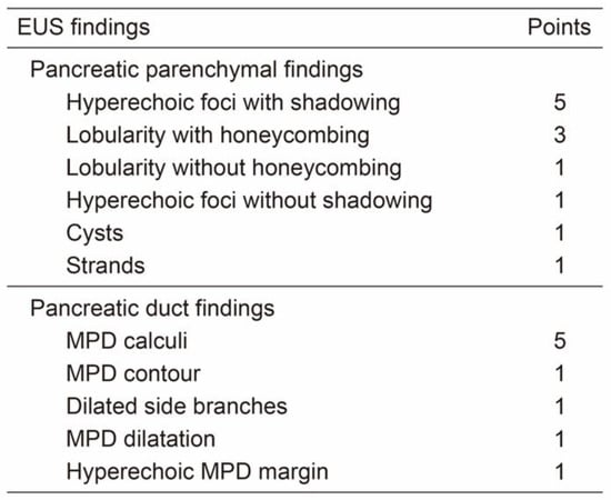 Endoscopic ultrasonography (EUS) is extremely useful for diagnosing chronic pancreatitis (CP), especially early CP (ECP). The Rosemont classification (RC), published in 2008 [], is commonly applied for diagnosing chronic pancreatitis (CP) by EUS. In fact, the RC is weighted for each EUS finding according to the CP severity.