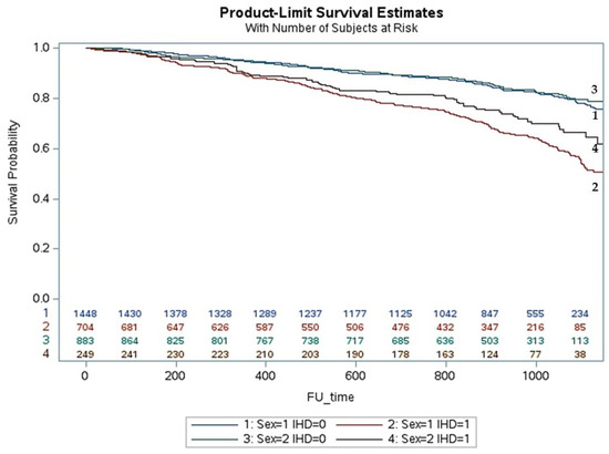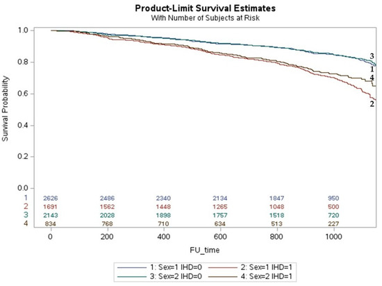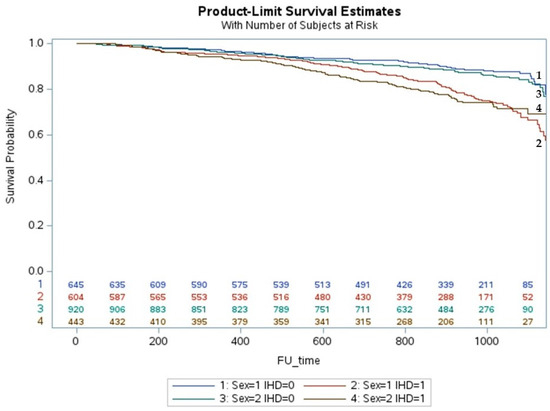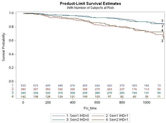 The life-table survival curves of women and men with chronic heart failure and nonischemic and ischemic cardiomyopathies. (sex = 1: men; sex = 2: women; IHD = 0: nonischemic cardiomyopathy; IHD = 1: ischemic cardiomyopathy).