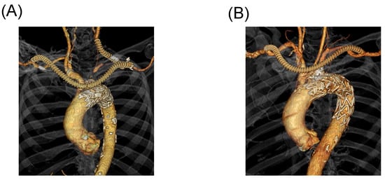 - Narita, H.; Komori, K.; Usui, A.; Yamamoto, K.; Banno, H.; Kodama, A.; Sugimoto, M. Postoperative Outcomes of Hybrid Repair in the Treatment of Aortic Arch Aneurysms. Ann. Vasc. Surg. 2016, 34, 55–61. [Google Scholar] [CrossRef] [PubMed]