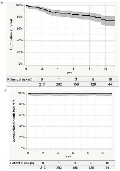 Of the 752 patients who had undergone TEVAR for aortic arch pathologies between April 2008 and October 2020, 213 who had undergone zone 1- (Figure 1A) and zone 2- (Figure 1B) landing hybrid TEVARs were enrolled. The mean follow-up period was 6.0 years (interquartile range [IQR], 2.8–9.7 years). None of the patients were lost to follow-up, and all patient data were available.