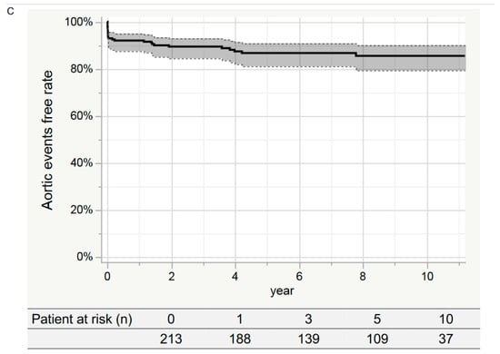 Kaplan–Meier curve in the entire study group. (A) Cumulative survival. The cumulative survival rate at 10 years was 73.6% (95% CI: 64.7–80.9%). (B) Aorta-related death-free rates. The event-free rate at 10 years was 90.8% (95% CI: 77.2–96.7%). (C) Aortic event-free rate. The event-free rate at 10 years was 85.5% (95% CI: 79.4–90.1%).