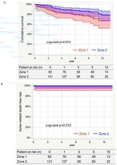 Figure 2B shows the aorta-related death-free rate at 10 years was 98.6% (95% CI: 95.7–99.5%). The 10-year event-free rates for the zone 1 and zone 2 groups were 97.6% (95% CI: 90.7–99.4%) and 99.2% (95% CI: 94.8–99.9%), respectively, with no significant differences (log-rank p = 0.312) (Figure 3B).