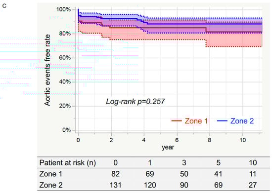 Figure 2C shows the aortic event-free rates at 1, 3, 5, and 10 years were 92.0% (95% CI: 87.5–95.0%), 89.4% (95% CI: 84.5–93.0%), 86.7% (95% CI: 81.1–90.9%), and 85.5% (95% CI: 79.4–90.1%), respectively. The 10-year event-free rates for the zone 1 and zone 2 groups were 81.4% (95% CI: 69.2–89.4%) and 87.9% (95% CI: 80.4–92.8%), respectively, with no significant difference (log-rank p = 0.257) (Figure 3C).