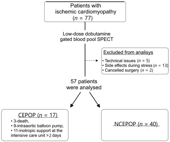Phase analysis based on cardiac single photon emission computed tomography (SPECT) data, reflecting ventricular mechanical dyssynchrony (MD), is a very promising and rapidly developing tool due to its high reproducibility and almost complete automation [6,7,8]. This approach showed predictive capabilities in a number of diseases [9,10,11,12]. Despite the wide usage of myocardial perfusion imaging for this purpose, the feasibility of this approach is controversial in the presence of extent perfusion defects. Gated blood pool SPECT (GBPS) overcomes this disadvantage since the contractility analysis is based on blood pool contouring and does not depend on the presence and extent of myocardial perfusion defects. One of the latest trends in phase analysis is an investigation of stress-induced changes in phase histogram indices and their association with outcomes [13]. However, the vast majority of these studies have been performed with vasodilator stress, which is less informative for detecting wall motion abnormalities than stress tests with inotropic agents. Only a few studies have investigated stress-induced changes in MD caused by inotropic stimulation [13,14], including the use of GBPS [6,13]. Nevertheless, there are no data related to the predictive value of stress GBPS-derived LV MD changes and complicated EPOP in patients with ICM.
