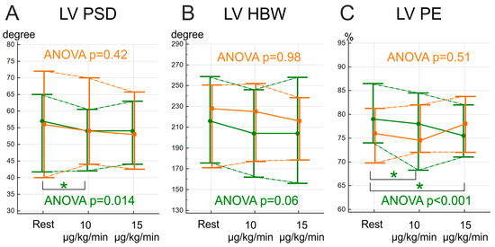 Stress-induced changes in left ventricle mechanical dyssynchrony indices during stress-test. The values are expressed as median and IQR (25–75). (A)—phase standard deviation (PSD); (B)—histogram bandwidth (HBW); (C)–phase entropy (PE); Orange lines and data—CEPOP; Green lines and data—NCEPOP; LV—left ventricle; Data are expressed in median and IQR (25;75). *—p < 0.016.