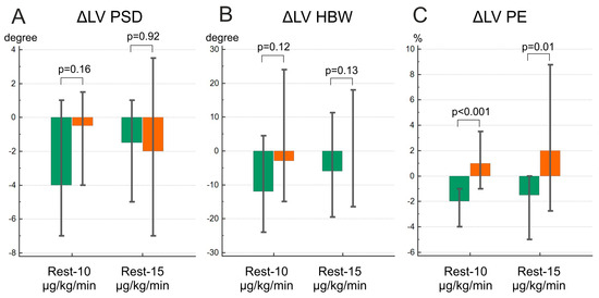 Based on the Friedman ANOVA test, significant changes during the dobutamine stress test were observed only in the NCEPOP group (PSD on the dobutamine dose of 10 µg/kg/min and PE on both dobutamine doses compared to the study at rest) (Figure 2). Nevertheless, PE in the CEPOP group showed an upward trend, more pronounced at the dobutamine dose of 15 µg/kg/min, while other MD indices demonstrated predominantly a decrease in or absence of changes. The comparison of deltas of MD between the groups revealed that only ∆PE differed significantly (p < 0.001 at the dobutamine dose of 10 µg/kg/min and p = 0.01 at the dobutamine dose of 15 µg/kg/min) (Figure 3). The GBPS values on each dobutamine dose are available in Supplementary Materials (Table S1).