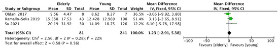 | N. of harvested lymph nodes | 3 | Young 14.02 (1.83) | Elderly 12.70 (2.31) | 0.96 | 0% | 0.16 | −1.51 (−3.62, 0.59) |