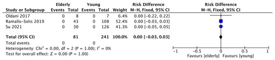 | Postoperative mortality | 3 | Young 0/241 | Elderly 0/81 | 1.00 | 0% | 1.00 | 0.00 (−0.03, 0.03) |