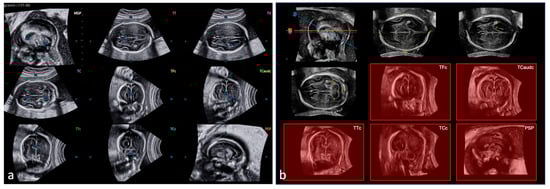 Diagnostic multi-image template of the fetal CNS anatomy at 20 + 3 weeks generated by 5DCNS+™ (panel (a)) and SonoCNS™ (panel (b)). The red-shaded planes (coronal and parasagittal) are generated manually using OmniView™ and are not reconstructed automatically by SonoCNS™.
