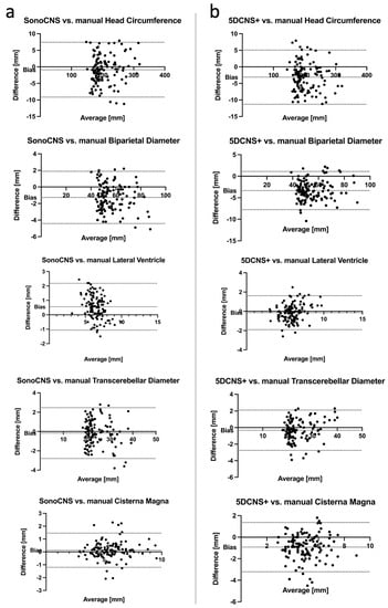 Bland–Altman plots of the differences between the manual measurements and the measurements taken by the programs SonoCNS™ (a) and 5DCNS+™ (b) for head circumference, biparietal diameter, posterior horn of the lateral ventricle, transcerebellar diameter and cisterna magna. Dotted lines represent bias (mean difference between the two techniques) and 95% limits of agreement (limits of agreement = mean observed difference ± 1.96 × standard deviation of observed differences). Note that SonoCNS™ showed lower deviation (a smaller bias) than 5DCNS+™ for head circumference, biparietal diameter, transcerebellar diameter and cisterna magna. In contrast, 5DCNS+™ showed a lower deviation for the lateral ventricle.