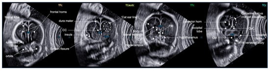 - Poon, L.C.; Sahota, D.S.; Chaemsaithong, P.; Nakamura, T.; Machida, M.; Naruse, K.; Wah, Y.M.; Leung, T.Y.; Pooh, R.K. Transvaginal three-dimensional ultrasound assessment of Sylvian fissures at 18–30 weeks’ gestation. Ultrasound Obstet. Gynecol. 2018, 54, 190–198. [Google Scholar] [CrossRef] [PubMed]