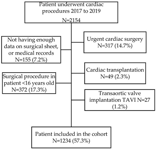 This retrospective observational cohort study was conducted at Virgen del Rocio University Hospital in Seville, Spain, between 2017 and 2019 and was approved by the Biomedical Research Ethics Committee. The study included all planned cardiac surgeries (such as valvular or bypass, combined valve-coronary artery bypass grafting (CABG), valve–valve, closure of intra-atrial communication (IAC) and thoracic aortic surgery, among others) for patients 16 years or older during the study period. Surgeries such as cardiac transplantation and transaortic valve implantation (TAVI) were not included. All patients received follow-up during hospitalization after the cardiac procedure until discharge or death.