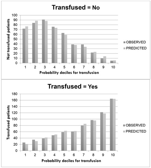 Calibration plots for transfusion prediction according to the proposed multivariable model.