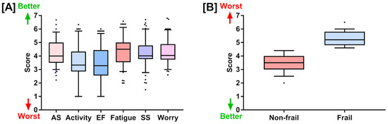 (A) Chronic liver disease questionnaire (CLDQ) scores for six health-related quality of life domains: abdominal symptoms, activity, emotional functions, fatigue, systemic symptoms, and worry. (B) Liver frailty index scores for the non-frail and frail groups. Both (A,B) are represented as box plots showing quartiles, 5th and 95th percentiles (whiskers), and minimum and maximum scores.