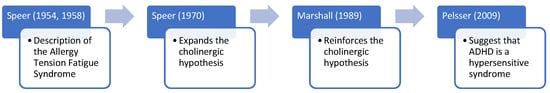 In 1954 and 1958, Frederic Speer, head of Pediatric Allergies at the University of Kansas, published two seminal studies focused on a new clinical entity, allergic tension-fatigue syndrome [1,2]. Speer allergic tension-fatigue syndrome (SATFS) can be defined as a syndrome characterized by (1) physical symptoms, including a constitutional allergic state, hyperhidrosis, pallor, infraorbital edema, headaches, and excessive lacrimation, salivation, and bladder tone [1,2]. The allergy-like symptoms, such as rhinitis and skin rashes, could be either triggered or worsened by exposure to certain foods or environmental factors; and (2) behavioral symptoms, including tension (i.e., restlessness, overactivation, hyperkinesis, aggressive irritability, apprehensive, antisocial), fatigue (i.e., lethargy, sluggishness, tiredness, boredoms interfering child’s progress in learning, oversensitiveness), and achiness (i.e., aching of the leg, arms, neck, and back). Speer stated that “Allergic tension may be defined as a clinical allergic state that is marked by diffuse neuropsychic overactivity. It includes both a motor component (hyperkinesis) and a sensory component (hyperesthesia). Usually, both hyperkinesis and hyperesthesia are present in the oversensitive allergic child” [2]. Interestingly, the particular behaviors displayed by either children or adults, including symptoms such as hyperkinesis, hyperesthesia (i.e., insomnia), restlessness, and distractibility, are very similar to recent descriptions of attention deficit hyperactivity disorder (ADHD), the most prevalent neurodevelopmental disorder worldwide [3]. ADHD symptoms typically encompass hyperactivity, inattention, and impulsivity. At the time that Speer published his work, the concept of ADHD was still emerging. As a matter of fact, Stella Chess was one of the first authors to nominate this syndrome in 1960 [4], and the concept that alludes to what we know today as ADHD only appeared in the third version of the Diagnostic and Statistical Manual of Mental Disorders (DSM-III).