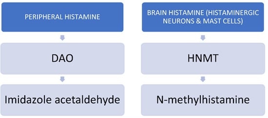 In order to avoid potential intoxication or the deleterious effects of excessive histamine in the body, histamine is metabolized by two main enzymes: the DAO enzyme and histamine-N-methyltransferase (HNMT) [11,12]. HNMT is responsible for the degradation of intracellular histamine, whereas DAO metabolizes histamine extracellularly [10]. Whenever the activity of either DAO or HNMT is insufficient, histamine is accumulated extracellularly or intracellularly, respectively. Under physiological conditions, DAO has low activity in the brain and mainly catabolizes histamine in peripheral tissues. However, whenever the activity of HNMT is inhibited, DAO may help to catabolize brain histamine [13,14]. See Figure 2.