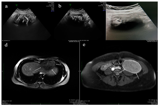 The clinical symptoms were dominated by chronic pain in the left iliac fossa, which progressively increased in intensity. A well-defined tumor mass was palpated in the left lower abdomen during clinical examination. The bimanual pelvic examination revealed a tumor mass with dimensions of 11 × 9 cm2, increased consistency, and reduced mobility, which was slightly painful. Blood count, liver, and kidney function tests were within normal limits. The ultrasound examination (Figure 1a–c) reveals a surgically excluded uterus with a 2.9 cm long cervix, 3.5 × 2.8 cm2 right ovary; the left ovary is not visible, instead a complex mass is identified in the left lower quadrant (left iliac fossa) with dimensions of 9.6 × 5.4 × 4.8 cm3, with hyperechoic areas alternating with anechoic areas, without highlighting a capsule, without Doppler signal. A mass with the same characteristics with dimensions of 8.5 × 4.9 cm2 was identified in the upper right quadrant. The MRI (Figure 1d,e) reveals expansive formations, ovarian on the left side and paracaval in the mid-paramedian abdominal floor on the right side, with an appearance suggestive of endometriosis cysts.