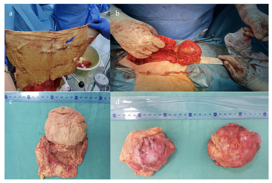 Elective exploratory laparotomy identified the presence of the two encapsulated masses adherent to the neighboring structures. During the inspection of the peritoneal cavity, adhesions of the omentum at the level of the anterior parietal wall are observed, as well as a surgically absent uterus, the appendix with right fallopian tube, and the ovary adhered to the level of the ascending colon. In the left iliac fossa, a tumor mass of approximately 12 × 10 cm2 is present, to which the parietal peritoneum, descending colon, sigmoid colon, and intestinal loops are adherent. It was completely removed en bloc with the omentum, left ovary, and fallopian tube. The second tumor mass of approximately 10 × 9 cm2 in the upper right abdominal quadrant was intimately adherent to the anterior parietal, peritoneum, the ileal loops, and the hepatic angle of the colon.