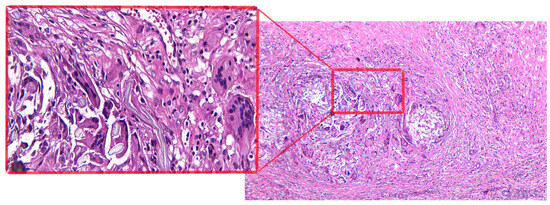 - Right subhepatic tumor mass: tissue fragment with a histopathological aspect of conjunctive-adipose and vascular–nervous tissue presenting multiple foci of chronic granulomatous inflammation with multinucleated foreign body giant cells arranged around exogenous, acellular, translucent materials; diffuse areas of fibroblast–fibrocystic proliferation; numerous groups of foamy histiocytes, some with a multinucleolate appearance; and moderate capillary hyperemia, interstitial edema (Figure 3).