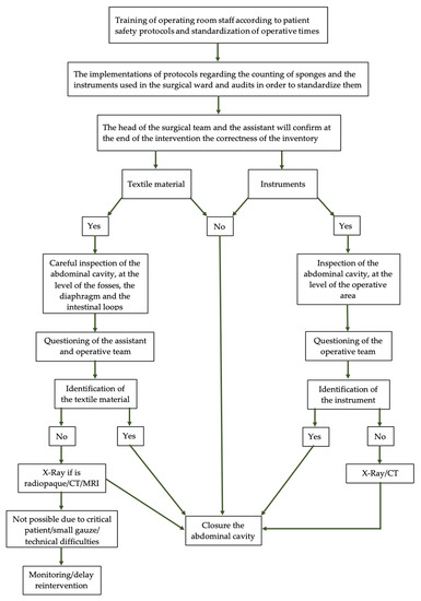 - Cima, R.R.; Kollengode, A.; Garnatz, J.; Storsveen, A.; Weisbrod, C.; Deschamps, C. Incidence and Characteristics of Potential and Actual Retained Foreign Object Events in Surgical Patients. J. Am. Coll. Surg. 2008, 207, 80–87. [Google Scholar] [CrossRef] [PubMed]