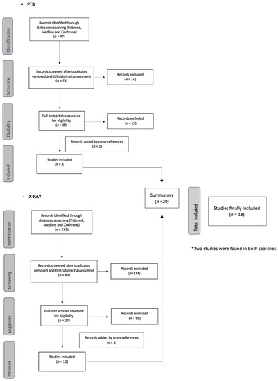 In a first search with the application of the inclusion criteria, 47 articles for PTB and 297 articles for plain X-ray were identified. After eliminating duplicates and reading the titles and abstracts, 18 articles for PTB and 27 articles for plain X-ray were selected for full-text evaluation. Finally, after eliminating the coinciding articles from the two searches, 18 studies were included in the analysis. Figure 1 shows the literature screening process.