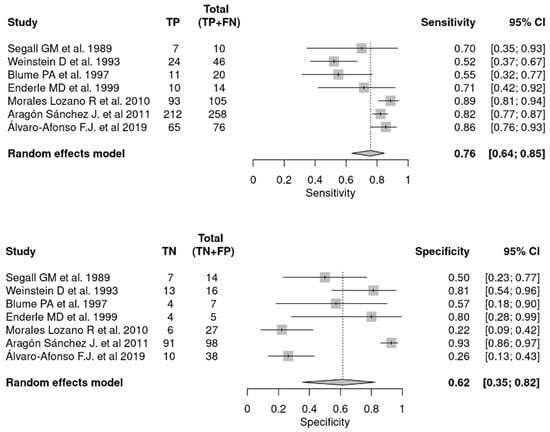SPE represents the ability to determine that a negative test result actually corresponds to a patient without DFO (true negative). The pooled value was 0.83 for the diagnostic combination of PTB + plain X-ray. This value is much higher than that obtained in the plain radiographic analysis (0.76) and slightly lower than that shown by the PTB test alone (0.86). It is well known that as a test becomes more sensitive, it becomes somewhat less specific, so we can determine that the values obtained show good diagnostic accuracy for the test combination.