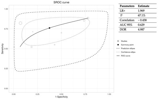 In the first analysis including all the studies [24,25,26,27,28,29,30,31,32,33], the pooled SEN and SPE were 0.68 and 0.74, respectively. I2 was estimated as 61.3%, LR+ was 2.61, the correlation index was −0.643, and DOR was 6.116. In the ROC curve analysis, AUC 95% was 0.496.