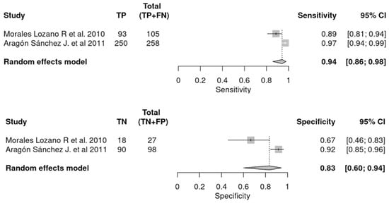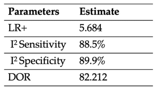 Two studies analyzed the diagnostic combination of PTB + plain X-ray compared to the gold standard [13,16]. In this case, a univariate analysis was carried out in order to determine the diagnostic accuracy of the combination of these tests. From the statistical analysis, the pooled SEN was 0.94, the heterogeneity was 88.5%, the SPE was 0.83, and the relative heterogeneity was 89.9%. LR+ was 5.874, and DOR was 82.212. These data are shown in Figure 6 and Figure 7. Figure 6 shows the estimates of LR+, I2 SEN, I2 SPE, and DOR. Figure 7 shows the pooled SEN and SPE of the combination of PTB and plain X-ray.