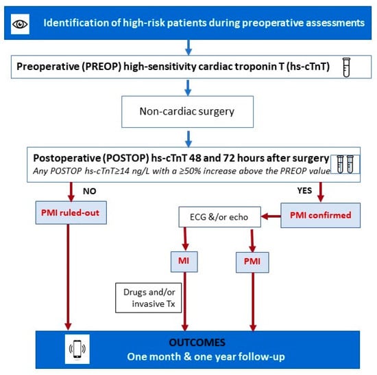 - Popova, E.; Paniagua Iglesias, P.; Alvarez Garcia, J.; Vives Borras, M.; Carreras Costa, F.; García-Moll Marimón, X.; Rivas Lasarte, M.P.; Gonzalez Osuna, A.; Martinez Bru, C.; Font Gual, A.; et al. Rationale and design of peri-operative myocardial ischemia: A protocol for troponin monitoring, prognostic thresholds, economic analysis, and further insights into pathophysiology for noncardiac surgery patients. F1000Research 2019, 8, 850. [Google Scholar] [CrossRef]