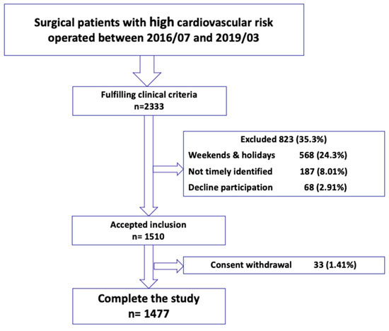 Despite some challenges and barriers, our dedicated research team successfully recruited two-thirds of all eligible high-risk patients and followed them for up to one year. The exclusion of weekend and holiday surgeries, primarily due to personnel unavailability, resulted in the loss of 24.3% of eligible cases. For the same reason, an additional 8.01% of cases were lost by delayed identification. In contrast, a minimal number of patients declined to participate, either before or after inclusion. Despite lacking the IT Department’s assistance to ensure automated requests, we were able to obtain extensive clinical data during pre, peri, and immediate postoperative steps. We achieved successful one-month and one-year follow-ups for all but one participant.
