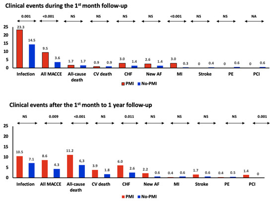 Percentages of clinical events observed in the earlier (first month, 1st-m) and subsequent (first month to one year, 1 y) follow-up periods. p-values are for comparison between respective follow-up periods in each subgroup (PMI, No-PMI) of patients. Abbreviations: NS—Not significant: MACCE—Major adverse cardiovascular and cerebrovascular events; CHF—congestive heart failure; AF—atrial fibrillation; MI—myocardial infarction; PE—pulmonary embolism; PCI—percutaneous coronary intervention. Definitions: All-cause death—any death attributed to a clearly documented non-vascular cause. Cardiovascular death—any death attributed to cardiovascular or unknown causes.