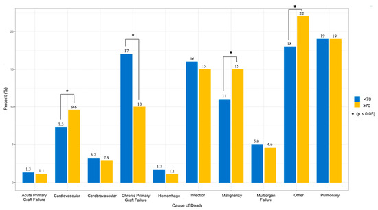There was a significant association between recipient age group and post-transplant ventilator duration with recipients ≥ 70 years having shorter ventilator durations (Table 3). They also had lower rates of post-transplant dialysis (5.6% vs. 7.5%), slightly shorter length of stay (16 vs. 17 days), and lower rates of treatment for rejection within one year of transplant (21% vs. 25%, p < 0.001). Recipients ≥ 70 had significantly lower one- and three-year survival rates (83% vs. 87% and 62% vs. 72%, respectively, p’s < 0.001), and there was an association between age group and cause of death (p < 0.001) with older recipients being more likely to die from cardiovascular and malignancy causes, but less likely to die from chronic primary graft failure (Figure 1).