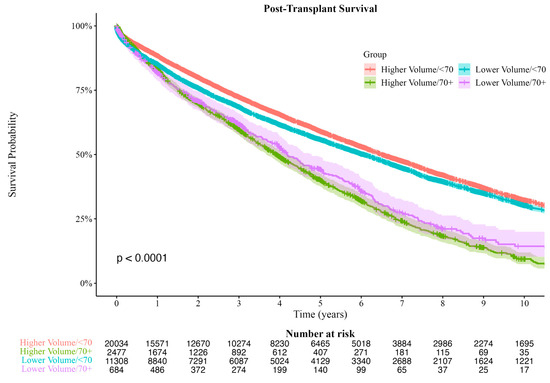 To investigate the association between age and survival time, patients were further stratified by center volume. There was a significant difference between groups in survival time (Figure 2, χ2(3) = 399, p < 0.001). Post hoc comparison between the four groups found that, in both HVCs and LVCs, recipients ≥ 70 had significantly shorter median survival times (HVCs: 3.7 years vs. 6.5 years; LVCs: 3.9 years vs. 5.9 years, both p < 0.001) than recipients < 70. In recipients < 70 years of age, HVCs had better median survival times compared to lower volume centers (6.5 years vs. 5.9 years, p < 0.001), but in recipients ≥ 70 years of age, there was no difference in median survival time between HVCs and LVCs (3.7 years vs. 3.9 years, p < 0.08). Survival analysis by Cox regression found that HVCs were associated with a survival advantage in recipients < 70 (HR: 0.91, 95% CI: 0.88–0.94, p < 0.001); however, in recipients ≥ 70, survival was similar between HVCs and LVCs (HR: 1.11, 95% CI: 0.99–1.25, p < 0.08).