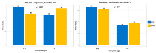 LVCs were more likely to have ≥70 recipients who were on average younger compared to HVC recipients (Table 4, 71 years vs. 72 years, p < 0.001). Although the difference in age at listing between LVCs and HVCs was statistically significant, it does not reach clinical significance due to the large sample size. LVCs had a greater proportion of ≥70 recipients of Black race compared to HVCs (4.5% vs. 2.6%, p = 0.026). Recipients ≥ 70 at LVCs were more likely to have pre-transplant mechanical ventilation (6.0% vs. 3.7%, p = 0.007), had significantly longer waitlist times (51 days vs. 29 days, p < 0.001), and were more likely than expected to be in the ICU at time of transplant (10% vs. 5.9%) and less likely to be not hospitalized relative to recipients at HVCs (81% vs. 85%, p < 0.001). LVCs were more likely to have recipients ≥ 70 with an obstructive diagnosis (21% vs. 17%) and were less likely to have recipients ≥ 70 with a restrictive diagnosis (77% vs. 82%, p = 0.37) compared to HVCs. There were no significant differences between recipient creatinine level, PA mean pressure, or O2 requirement between HVCs and LVCs, and the LAS at listing and removal were also similar. HVCs were more likely to perform a bilateral lung transplant for patients with obstructive lung disease compared to low volume centers (Figure 3, 54% vs. 44%, p = 0.37); however, for patients with restrictive lunge disease, the rates of bilateral lung transplants were similar for HVCs and LVCs (38% vs. 34%, p = 0.11).