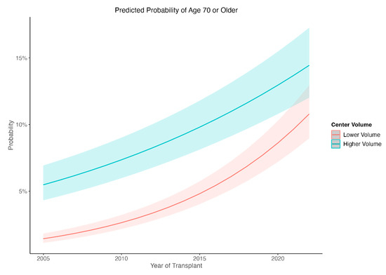 Interaction Between Center Volume and Transplant Year Predicting Likelihood of Transplant Recipient Being ≥70 Years Old.