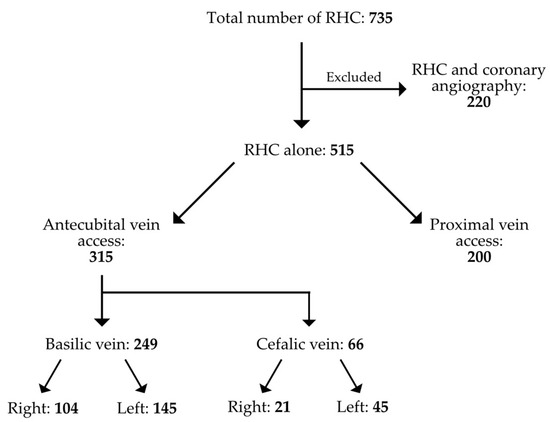 Of these, 220 were excluded from our retrospective analysis since other invasive procedures (i.e., diagnostic and therapeutic coronary angiography) were performed. The remaining 515 procedures consisted of RHC; 315 were carried out through an antecubital access and 200 through a proximal vein access. These were subdivided into femoral vein access (