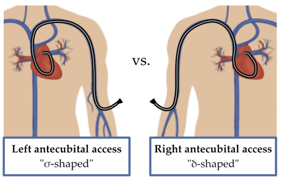 To the best of our knowledge, this is the first time that right and left antecubital access have been compared. Our findings show that patients cannulated on the left side exhibited a statistically significant decrease in fluoroscopy time despite no reduction in radiation exposure. This evidence highlights that left antecubital access requires reduced fluoroscopy time compared to right antecubital access, although no statistically significant reduction in radiation exposure was found. We hypothesized that the presence of anatomical curves inside the major venous vessels up to the right atrium might be responsible for such an unexpected finding. Indeed, we supposed that the σ-shaped (sigma-shape) venous pathway followed by guidewires and catheters in the left antecubital access to reach the right-sided cardiac chambers might be easier to navigate than the δ-shaped (delta-shape) pathway in the right-sided antecubital access (