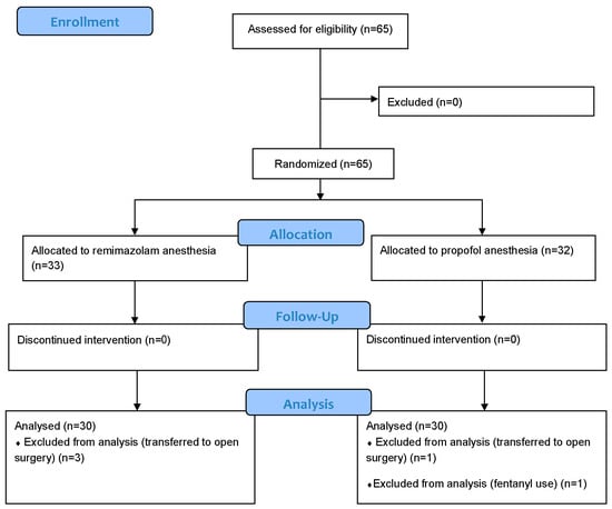 Sixty-five women were enrolled in this study between February and September 2022, none of whom were initially excluded. In total, 33 and 32 patients were randomly assigned to the REM and PROP groups, respectively (Figure 1). In total, 5 patients were excluded from the study due to surgical complications, resulting in 30 patients in each group. There were no significant differences in patient background between the two groups (Table 1). No significant differences were found for all the examined endpoints, including the incidence of PONV, vomiting without nausea, rescue antiemetic or analgesic use, and nausea severity in the two groups.