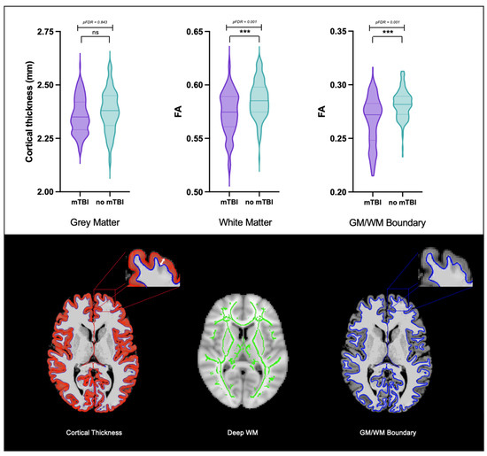 Group differences between participants with mTBI and participants without mTBI. ANCOVA revealed significantly lower whole-brain GM/WM boundary FA (pFDR = 0.001), and deep WM FA (pFDR = 0.001) in mTBI subjects compared to participants without mTBI. No significant differences were observed between groups in cortical thickness (pFDR = 0.843). The area of the brain where the imaging measure was acquired is displayed beneath for better visualization. Note. mTBI, Mild traumatic brain injury; FA, Fractional Anisotropy; ns = not significant; *** = p < 0.001.