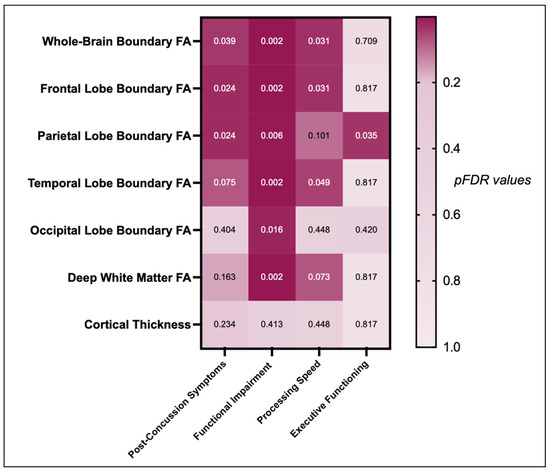 Association between GM/WM boundary diffusion, deep white matter, cortical thickness, and long-term outcomes (symptoms, functional impairment, processing speed, executive functioning), displayed by a heatmap of pFDR-values. Dark red boxes indicate a stronger relationship between imaging and outcome measures, whereas brighter boxes indicate a weak relationship between imaging and outcome measures. Note. FA, Fractional anisotropy.