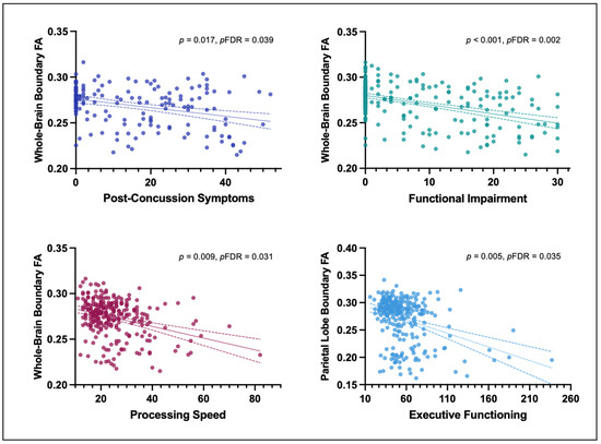 Having more post-concussive symptoms (RPQ13) was significantly negatively correlated with lower whole-brain (r = −0.19, p = 0.017, pFDR = 0.039), frontal (r = −0.21, p = 0.007, pFDR = 0.024), and parietal (r = −0.21, p = 0.006, pFDR = 0.024) GM/WM boundary FAT, but not with temporal (r = −0.16, p = 0.043, pFDR = 0.075) and occipital GM/WM boundary FAT (r = 0.06, p = 0.404, pFDR = 0.404), deep WM FAT (r = −0.12, p = 0.117, pFDR = 0.163), or cortical thickness (r = 0.10, p = 0.201, pFDR = 0.234).